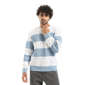 Self_Patteren_Knitted_White_And_Blue_Round_Collar_Pullover_White_And_Blue