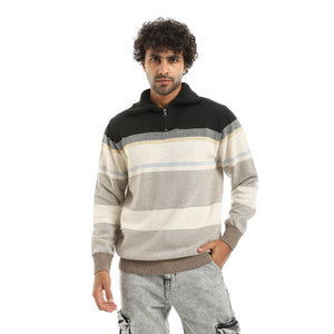 Half_Neck_Zipper_Closure_Stripped_kNitted_Pullover_-_Beige_&_Navy