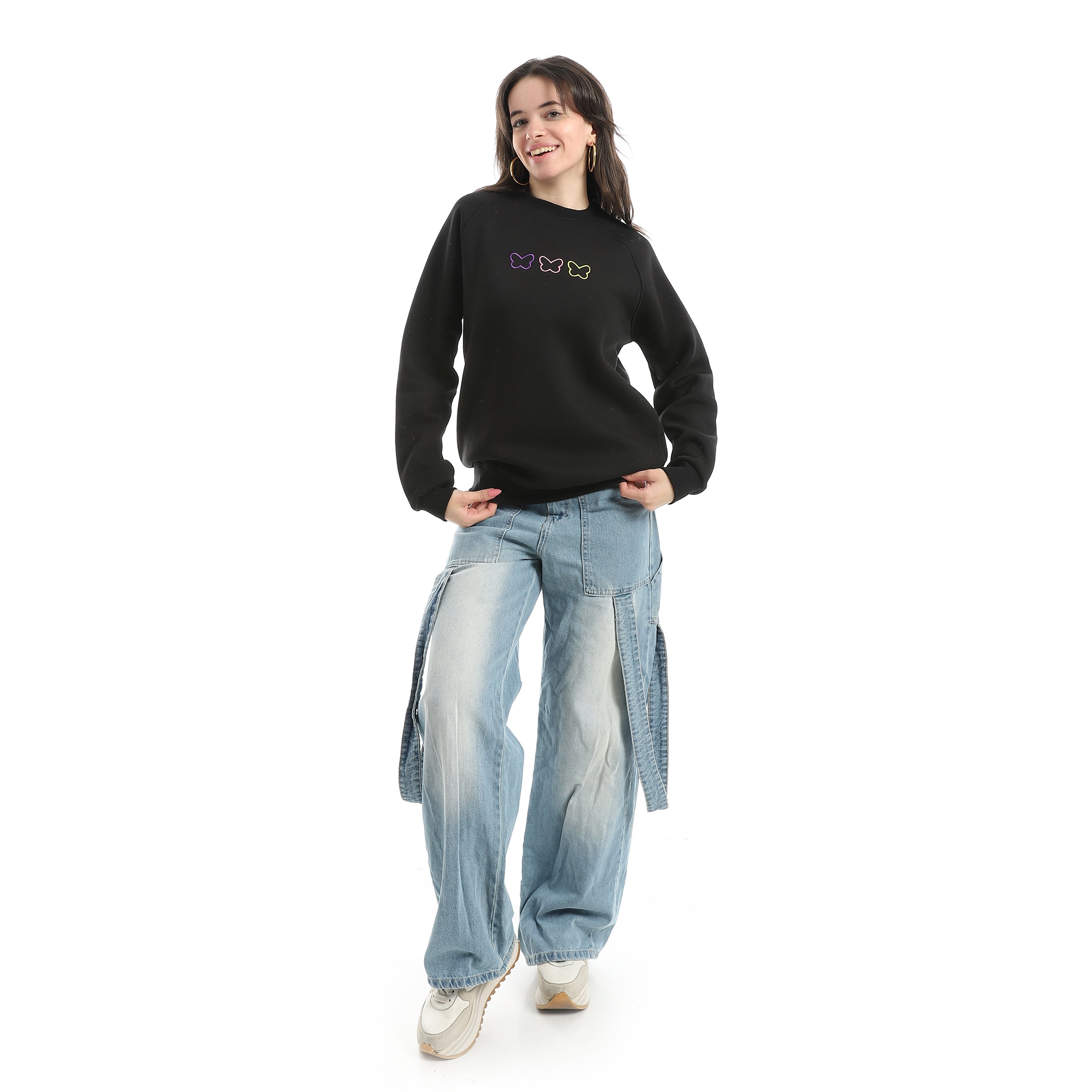 Embrodried_Long_Sleeves_Round_Collar_Sweatshirt_-_Black