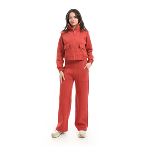 Vermilion_Red_Zipped_Long_Sleeves_Elastic_Waist_Pants_Set-Vermilion_Red