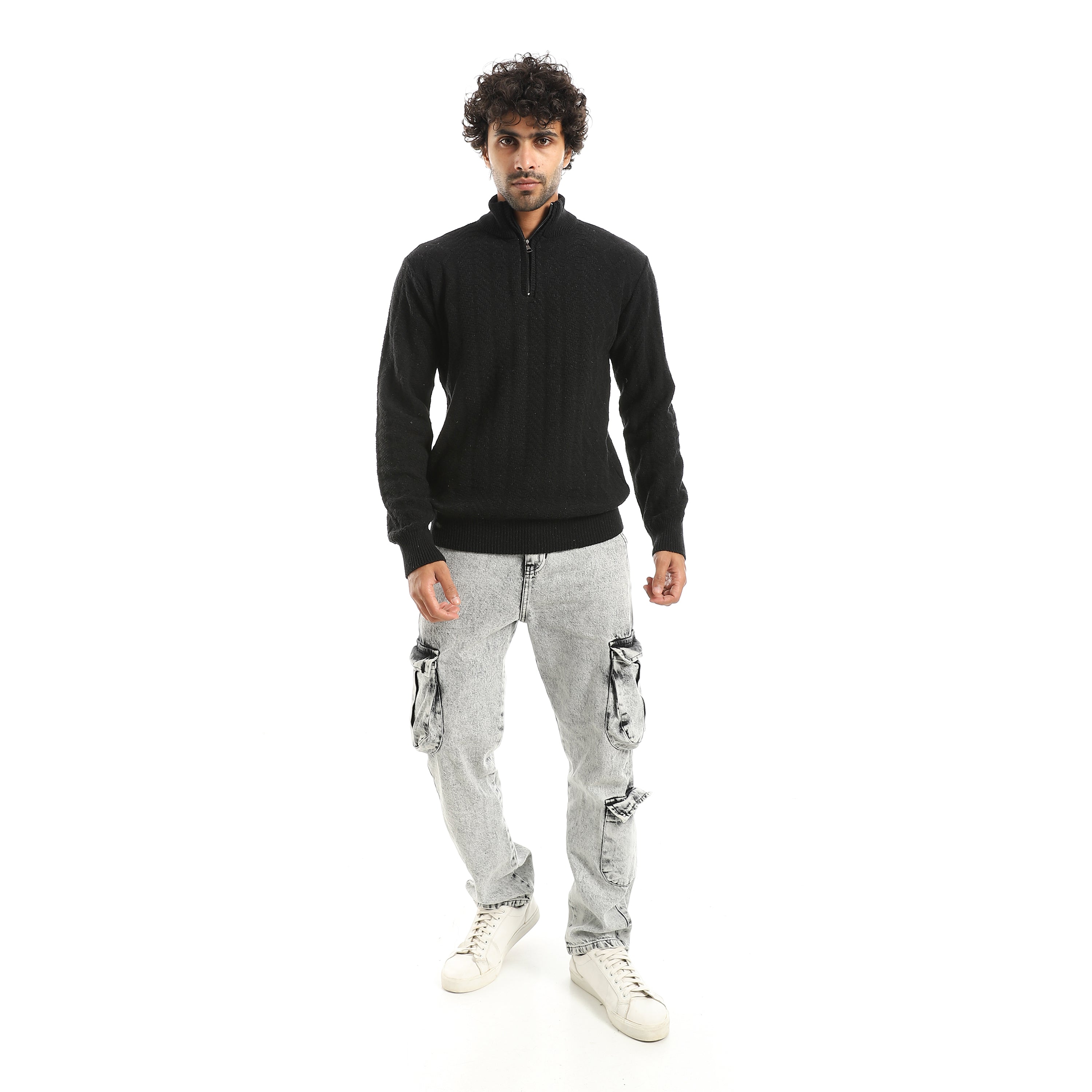 Half_Zipper_High_CollarPlain_Long_Sleeves_Black_Pullover_Black